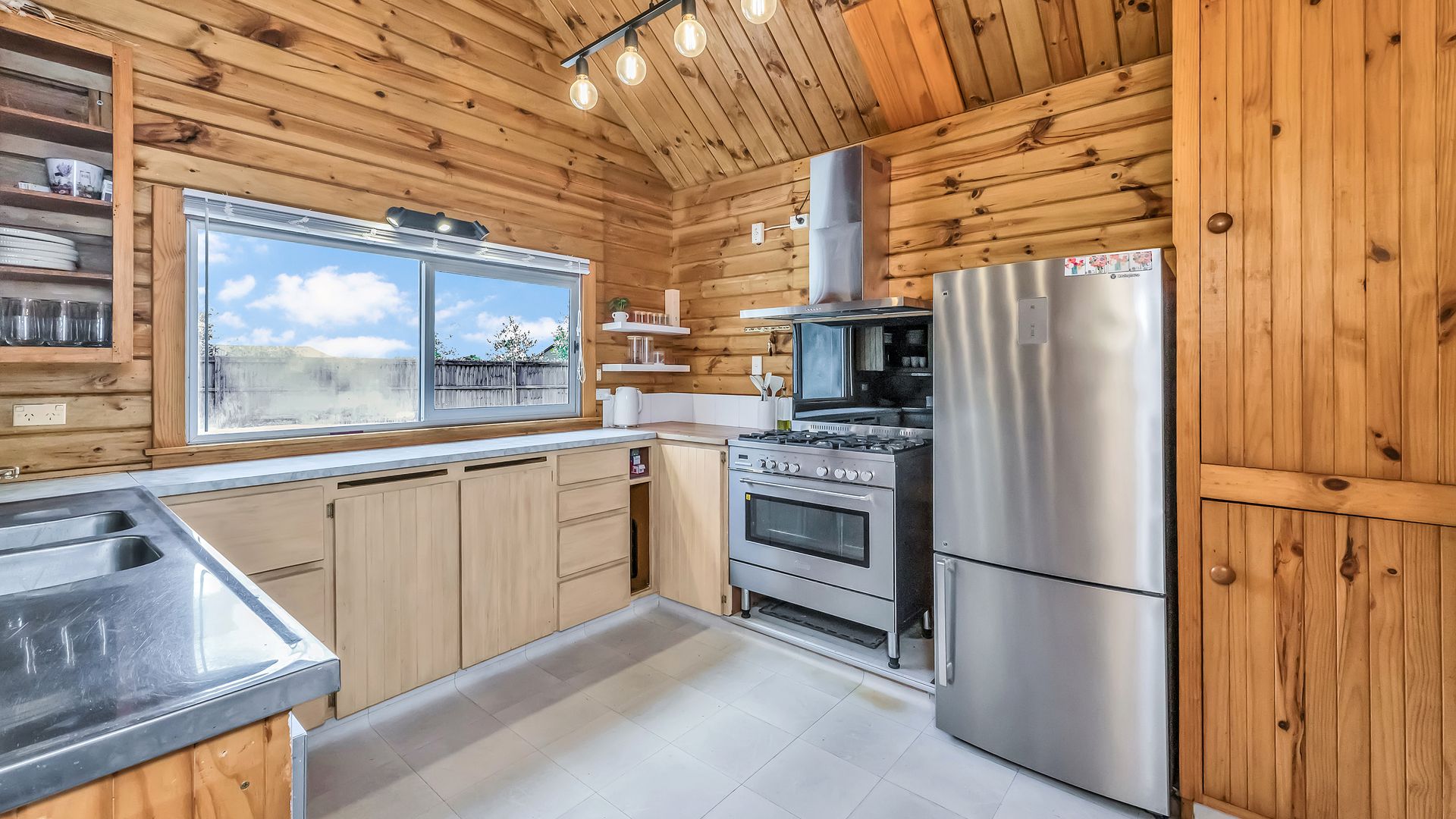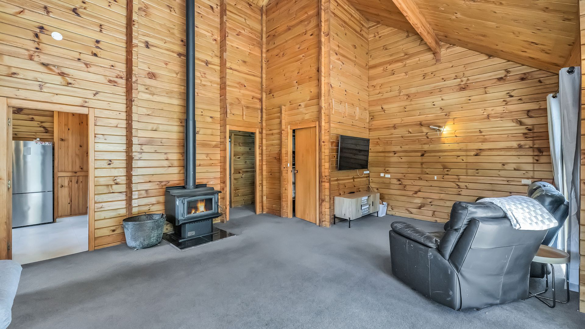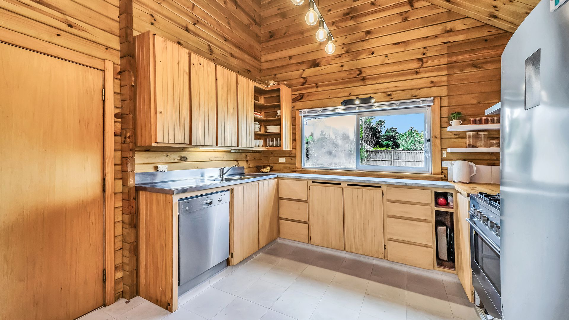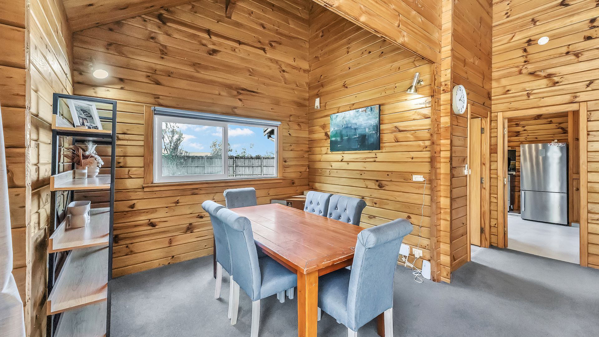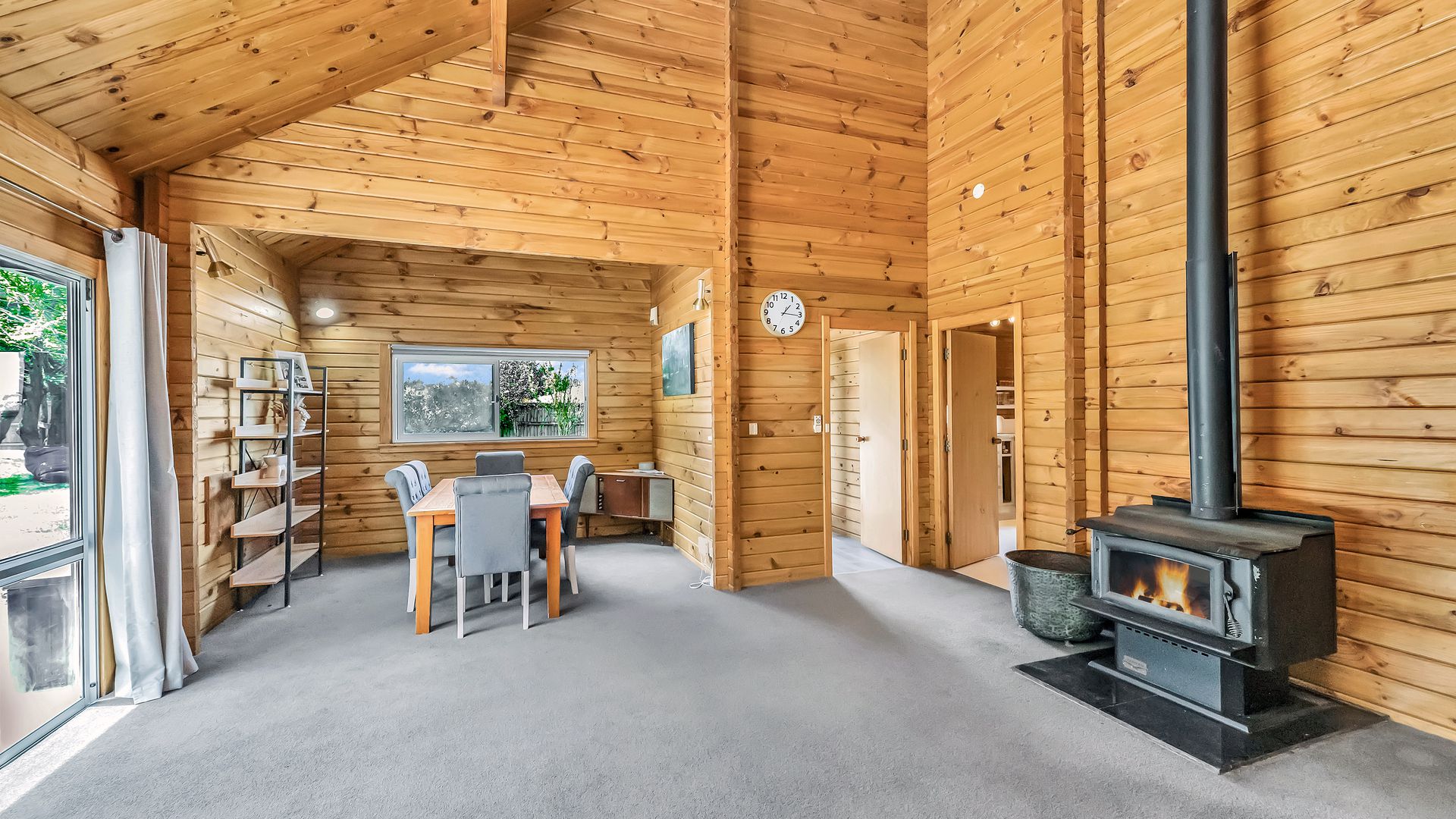 The home itself is comfortable and easy-care, offering a practical layout with a relaxed timber-lined interior. The kitchen sits at the heart of the home and connects to the dining and living area – a cosy, functional space designed for uncomplicated everyday living. A log burner and heat pump ensure comfort through every season.
