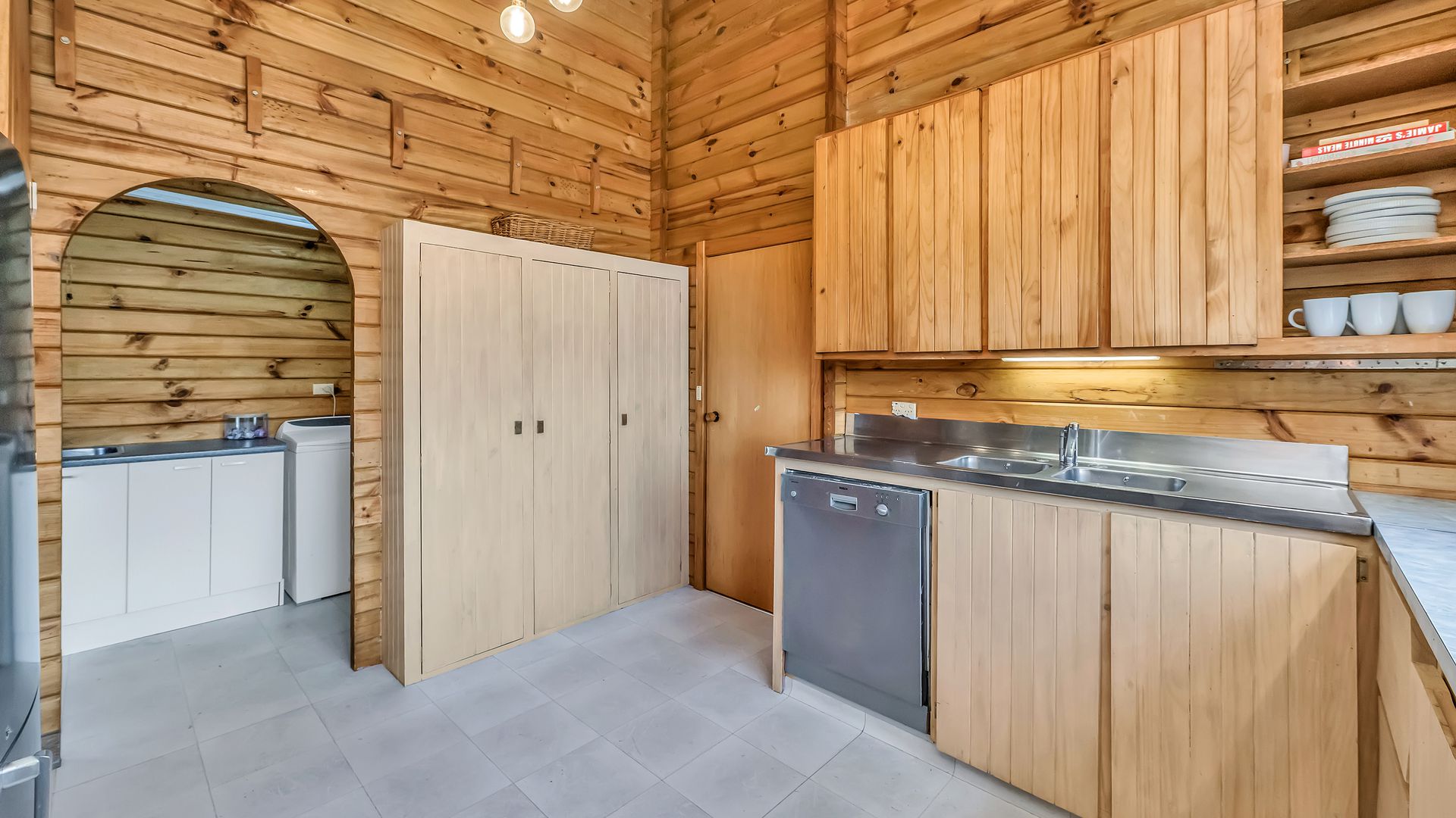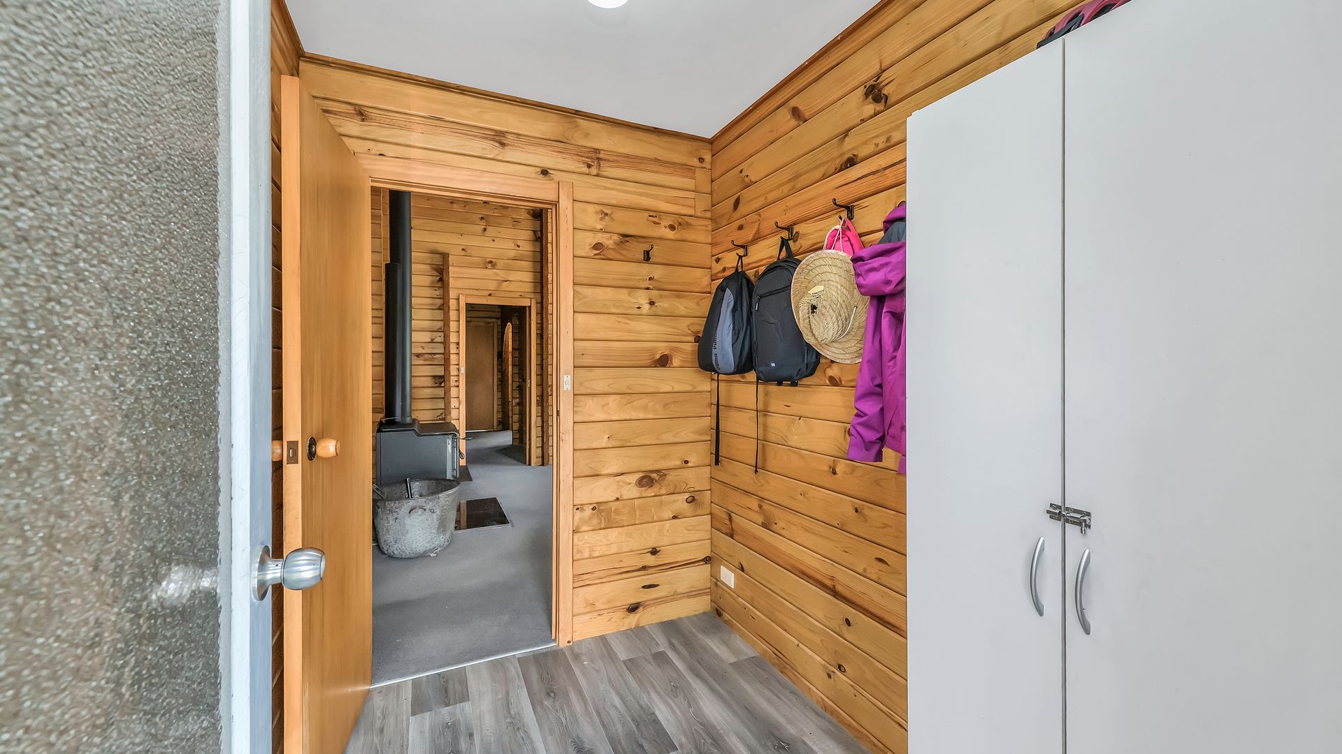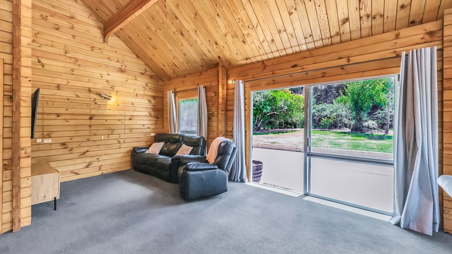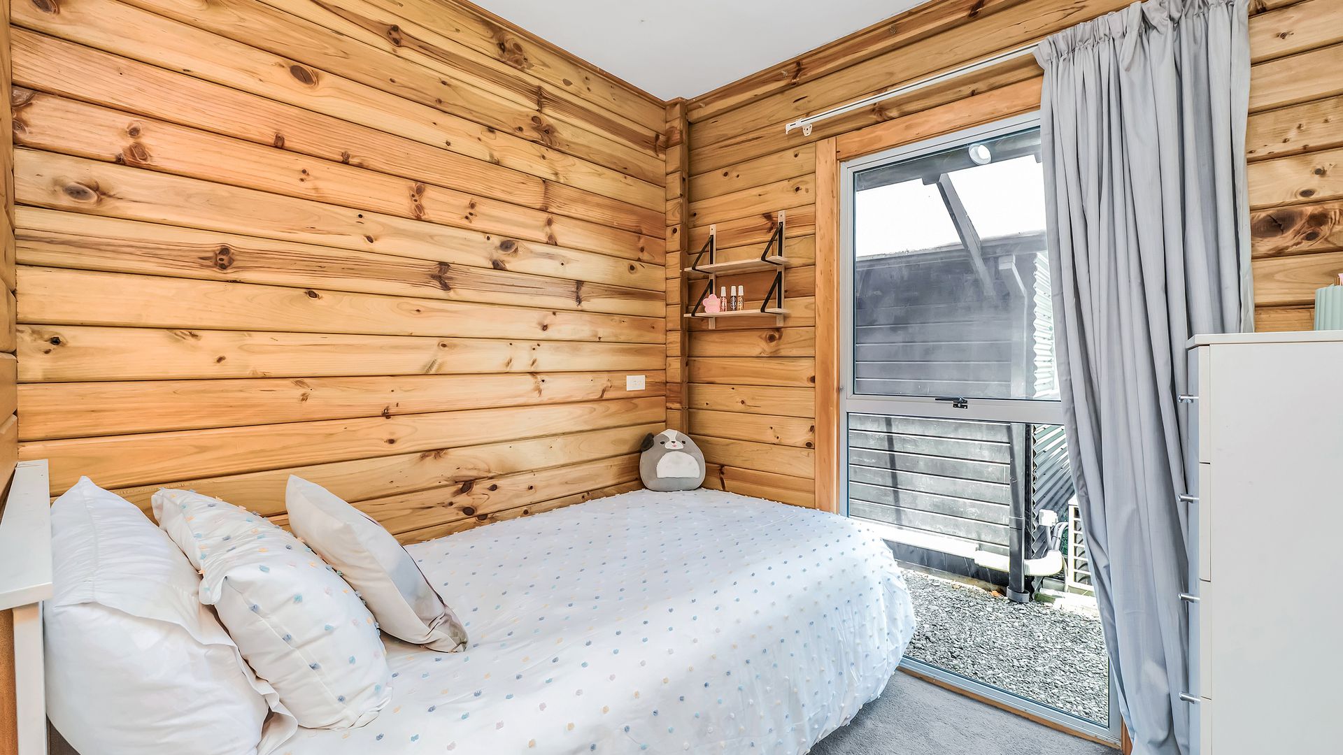 The home itself is comfortable and easy-care, offering a practical layout with a relaxed timber-lined interior. The kitchen sits at the heart of the home and connects to the dining and living area – a cosy, functional space designed for uncomplicated everyday living. A log burner and heat pump ensure comfort through every season.